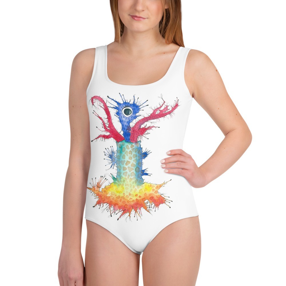Come swim with the Spoortles in this cute one-piece swimsuit. Whether you’re swimming in the Brumptle Sea, Swamp Ebegobe, your local beach, or own back yard pool, the Spoortles are the best companions. “What are these lovely creatures?”, your envious mates will ask. Besides what want in a youth swimsuit? Comfort? Check! Soft fabric? Check! Very silly and cute? Double check!! As you can see, it has everything a girl would love in a swimsuit for those active beach or pool days!